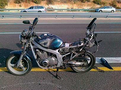 האופנוע לאחר התאונה, מות הרוכב נקבע בדרך לביה"ח (צילום: חגי אהרון)