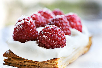 לא כל כך נוח לאכול עוגות מילפיי, הן מתפוררות כבר בניסיון לחתוך את החתיכה הראשונה. לכן, בחרתי להביא לכם מתכון לעוגה פתוחה, כלומר בצק העלים משמש רק לחלק התחתון, וללא לכיסוי, כנהוג ברוב העוגות (כדוגמת הקרמשניט). העוגה הפתוחה משרתת אותנו גם בהגשה המיוחדת כיוון שרואים את הפרי האדום.