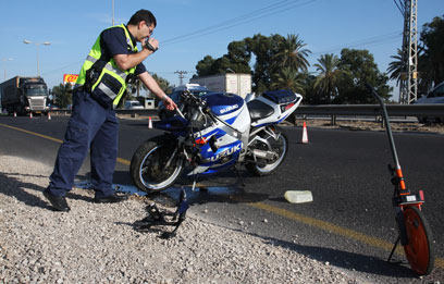 שוטר לצד האופנוע שהיה מעורב בתאונה (צילום: אבישג שאר-ישוב)