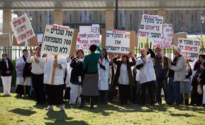 עובדי בית החולים "ביקור חולים" בירושלים מפגינים היום (ב') מול משכן הכנסת, שם מתנהל הדיון בדרישה לתוספת של 30 מיליון שקל לתקציב בית החולים. העובדים לבושים בחלוקים לבנים ונושאים שלטים שעליהם נכתב, בין היתר, "ביבי מפקיר את בריאות תושבי ירושלים".