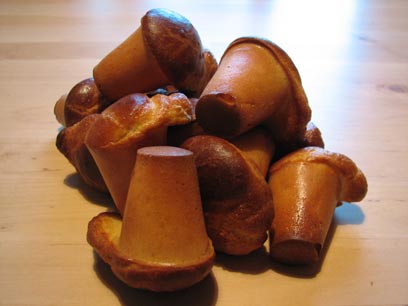 - מפילים את הבצק וממלאים בתבניות עד 3/4 גובה התבנית. אם זו איננה תבנית סיליקון, יש לשמן את התבנית בחמאה ולפזר עליה סוכר.