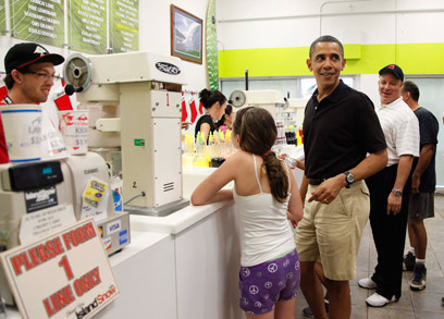 חופשה נינוחה. אובמה רוכש גלידה עבור ילדותיו בהוואי (צילום: AP)