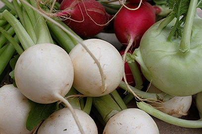 בחורף, אפילו בזה התאורטי שלנו, תשמח הכוסמין לארח חברים שורשיים ממשפחת המצליבים (כל הכרוביים למיניהם שמצטיינים בגוון טעם חריף וריח חזק בבישול, ונקראים כך בגלל צורת הצלב שיש לעלי הכותרת של פרחיהם) שהם עכשיו בשיא עונתם: יפים, עסיסיים וטעימים במיוחד. אני בחרתי בלפתות פצפונות שעוד לא הספיקו אפילו להעלות סומק בלחיים, צנוניות בורוד פוקסיה (כמו שאפיינה הנסיכה המומחית לגוונים), קולורבי קטן וירקרק וצרור של עלי ארוגולה, שקטפתי בגאווה רבה ישר מהגינה, עם טיפות של גשם תלויות עדין בקצותיהם.