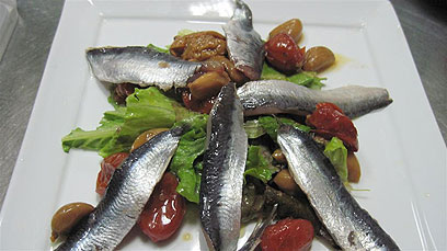 - סרדינים כבושים עם סלט מבושל של עגבניות שרי במרטיני.