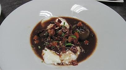 - Oeuf en meurette (מנה מבורגון של ביצים עלומות ביין אדום, בייקון ופטריות).