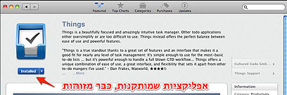 לבסוף, אפליקציות שכבר רכשתם בעבר מהמפתחים עצמם יזוהו על ידי החנות ויוצגו כאילו הן כבר מותקנות, למרות שלא רכשתם אותן מחנות האפליקציות. לא כל האפליקציות מזוהות - זה כנראה עניין של קוד שצריך לשנות ברמת התוכנה. כך למשל Things זוהתה מיד ואילו Pixelmator לא. משונה גם ש-iLife 11 זוהתה כמותקנת, אבל iWork לא לא זוהתה.