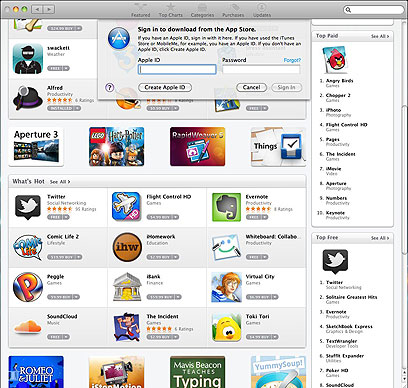 בקליק אחד. מצאתם אפליקציה (נגיד Twitter בגרסתה החדשה)? פשוט לחצו על הלחצן הקטן שמציג את המחיר או המילה Free. אם זו הפעם הראשונה שהשתמשתם בחנות, תתבקשו להירשם עם ה-Apple ID שלכם. אם כבר נרשמתם תתבקשו רק לאשר את הקנייה על ידי הקלדת הקוד שלכם לחשבון. מייד לאחר מכן התוכנה תותקן על המחשב - הצלמית שלה תופיעה על ה-Dock יחד עם בר התקדמות קטן וכחול (כמו באייפון). כאשר האפליקציה תותקן תוכלו להפעילה מייד.