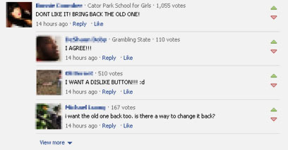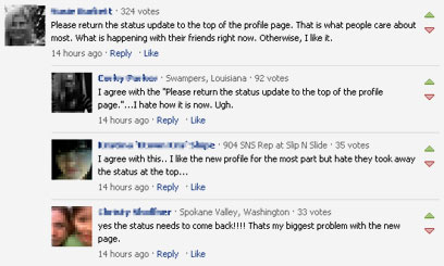 כמובן שמבול התלונות לא איחר להופיע בבלוג אחרי הידיעה. אחרי מאות תלונות ה"דיסלייק!" הפאבלוביות, הביקורת המרכזית הייתה נגד חוסר יעילותו של הפרופיל החדש במעקב אחר הפעילויות האחרונות של המשתמשים.