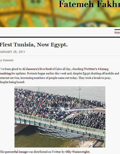 גם בלוגרית איראנית זו תוקפת את השלטון המצרי ואת התנהגות כוחות הביטחון, ומעלה תמונות שמועברות אליה ממצרים. גם באיראן היתה המדיה החברתית כלי מרכזי להעברת מסרים עת הפילה ממשלת אחמדינג'אד את הרשת לאחר הבחירות בשנה שעברה.