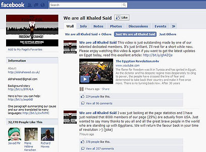 ובפייסבוק חברים למעלה מ-30 אלף איש בקבוצה ששמה "כולנו חאלד סעיד" (בלוגר מצרי שנחשד כי נרצח על ידי שני שוטרים). מנהלי הקבוצה המצרים מרכזים בה עדכונים שוטפים מההפגנות, הכרזות פוליטיות, וגם תמונות סרטונים שצולמו ונערכו על ידי חברי הקבוצה: