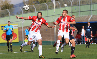 עודד גביש ואבי יחיאל הודפים התקפה של עפולה (צילום: חגי אהרון)