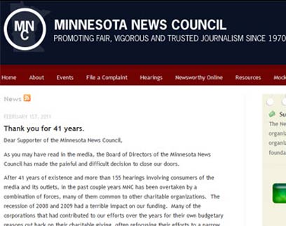 בימים אלה הגיעה לקצה פעילות בת 41 שנה של מועצת העיתונות במדינת מינסוטה שבמערב התיכון של ארצות-הברית. בהודעה שפורסמה בשבוע שעבר באתר המועצה נמסר כי פרנסי הארגון נאלצו "לקבל החלטה כואבת וקשה לסגור את דלתותינו". המועצה, שנועדה לקדם "עיתונות הוגנת, איתנה ואמינה", הוקמה בשנת 1970 והיתה הבולטת והפעילה בין קומץ מועצות כאלה בארצות-הברית. עם התפרקותה נותרו שם רק שלוש מועצות עיתונות – במדינת וושינגטון, בניו-אינגלנד ובהוואי.