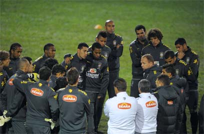 מאנו מנזס מתדרך את שחקני נבחרת ברזיל (AFP)