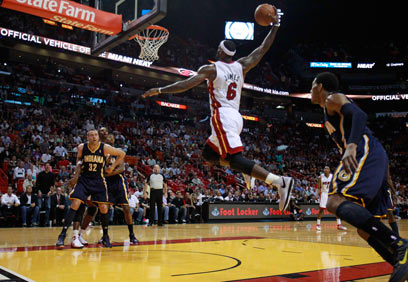 לברון ג'יימס מטביע על הראש של אינדיאנה פייסרס (רויטרס)