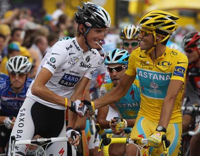 אלברטו קונטאדור ואנדי שלק בתום הטור דה פרנס ב-2010 (גטי אימג'ס)