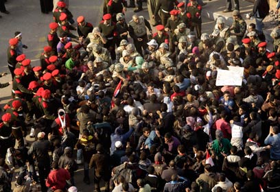 עוד לא מתפנים. מפגינים וחיילים בכיכר א-תחריר, הבוקר (צילום: רויטרס)