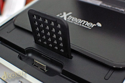 בחלקו העליון של ה-iXtreamer מכסה שחור מבריק, שנע על מסילה לאחור וחושף התקן המיועד למכשירי אפל השונים, זוהי תחנת עגינה משולבת, שכוללת שקע למחשב לוח (טאבלט) מדגם אייפד, לנגן מדגמי אייפוד או למכשיר אייפון. המכשיר מגיע עם תושבת פלסטית קטנה, שמאפשרת עמידה יציבה של נגן אייפוד או אייפון, ומשענת פלסטית לאייפד שנשלפת מתוך צידו השמאלי של גוף הסטרימר - פטנט חביב בהחלט.