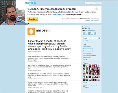 בעוד רבים מעמיתיה הביעו זעזוע מתקיפת העיתונאית האמריקנית לארה לוגן במצרים, אחד מהם בחר להתבדח על כך בטוויטר - ושילם על כך מחיר מקצועי. העיתונאי העצמאי ניר רוזן, שכמו לוגן, סיקר בעבר את המלחמה בעיראק, צייץ הערות פוגעניות והטיל ספק בחומרת הפגיעה בעיתונאית. לוגן השתחררה בינתיים מבית החולים ומתאוששת בחיק משפחתה.
