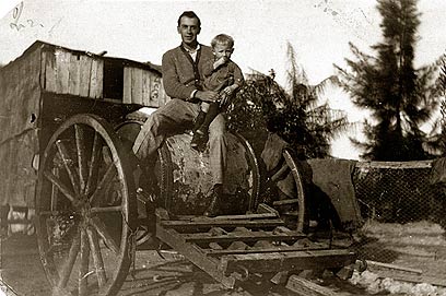 20. גדרה 1926, אריה שרמן עם הילד אביבי על עגלת מיכל מים להשקייה