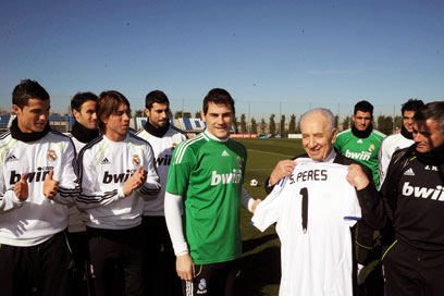מסע בין כוכבים. נשיא המדינה, שמעון פרס, המבקר בימים אלה בספרד, הגיע הבוקר (ה') לאימון ריאל מדריד והצטלם למזכרת עם כוכבי קבוצת הגלאקטיקוס.