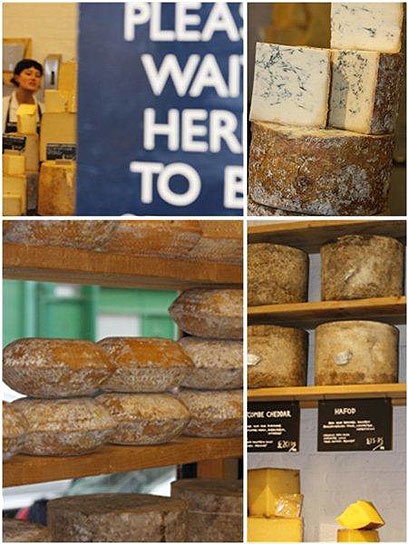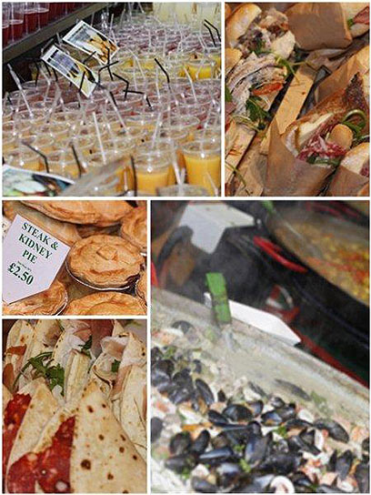 דגים ופירות ים שמריחים כמו האוקיינוס בעצמו, ככרות ענק של גבינות צרפתיות, מוצרלה, פרמזן, פרושוטו וסלמי איטלקים, נקניקיות גרמניות, חזרת פולנית, המעדנייה האנדלוסית של ברינדיסה עם חומץ השרדונה הלבן האהוב עליי, חנות הגבינות המפוארת של מחלבת נילס יארד עם גלילי הצ'דאר והסטילטון המשובחות ואפילו דוכן שמוכר חומרי גלם מקסיקניים ומכשיר להכנת טורטיות ביתיות מקמח תירס מיוחד (קניתי. בטח קניתי. מבטיחה פרטים ומתכונים בקרוב מאוד). אפשר להצטייד פה גם באוכל מוכן מכל מיני סוגים מסנדוויצ'ים וראפס, דרך צלוחיות של קארי ירוק ואדום מהבילים, המבורגרים מבשר אורגני מקומי ונקניקיות על מרבץ כרוב כבוש מצוירות בחרדל ועטופות בלחמנייה טרייה ולקינוח קפה ועוגה, עוגיות, מאפינס או קרואסון. מבחר אינסופי.