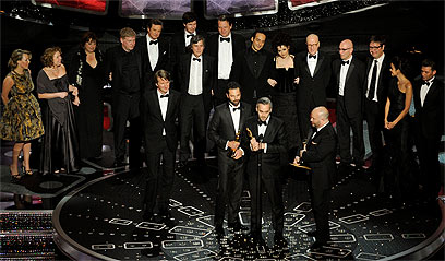 צוות "נאום המלך" חוגג על הבמה (צילום: רויטרס)
