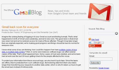 בתגובה לתקלה בתיבות הג'ימייל, שאיפסה חשבונות של גולשים ומחקה את כל התכנים האישיים בהם, גוגל פרסמה (ב') התנצלות רשמית בבלוג ג'ימייל אמש (ב'). הסיבה לתקלה לפי גוגל - "שיחרור עידכון לתוכנת איחסון שהיה בה באג לא צפוי".