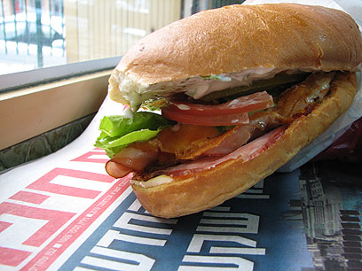 האף שלי סיפר לי שמישהו קולה לחם ואכן על פלטה קטנה כבר נקלו ארבעה חצאי לחם. בשטח הפנוי שנשאר על הפלטה הניחה ברכה פרוסות דקות של שינקן ופרוסות גבינה צהובה. הנקניק נצרב בשומן של עצמו כשהגבינה ניתכת מעליו ומתחתיו. הריח שעולה ממיזוג החזיר בחלב פרתו משבש לי את המחשבות. ברכה לוקחת שני חצאי לחם, מורחת על חצי אחד חריף (לבקשתך) ומיונז, ועל החצי השני חרדל ומיונז עם שמיר ושום. היא מניחה פרוסות מלפפון חמוץ, פרוסות עגבנייה טריה, כמה עלי חסה רעננים ופריכים ואת הנקניק עם הגבינה שהפכו ליחידה אחת. עוטפת היא הכל בנייר, מכניסה לשקית (למניעת נזילות) ו"בואי את, בתיאבון!", עינת מקבלת את הכריך שלה, ו"בוא אתה, בתיאבון!" וגם אני זוכה. הביס הראשון הפיק "קחחח..." מקצועי ושילוב הטעמים בו היה מושלם. היה זה סנדוויץ' גדול במקום קטן.