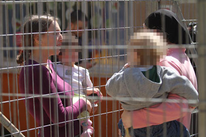 משני צדי הגדר. שתי אמהות וילדיהן בחצר הגן (צילום: גיל יוחנן)