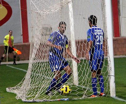 הכדור ברשת. הפועל פ"ת ספגה שוויון אכזרי (צילום: חגי אהרון)