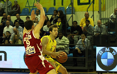 ניב ברקוביץ' חולף על פני גל מקל בדרך לסל (צילום: רועי עידן)