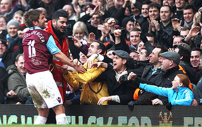 תומאס היצלספרגר חוגג את השלישי של ווסטהאם (צילום: גטי אימג'ס)