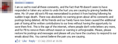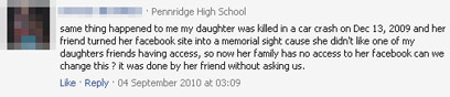 אחת המגיבות לפוסט, רייצ'ל קופר, התלוננה על מחיקת ההודעות והפוסטים של בנה, שמת בגיל 19. "לכל חבריו ומשפחתו נגרם הכאב הנוסף של אובדן כל התרומה שלו בכתב לחיינו, בלי האפשרות לשמור אותה קודם לכן. זה עידן האינטרנט, בו אנשים לא כותבים מכתבים יותר..." כתבה. אוונג'לין תומפסון, שאחיה נהרג גם כן, איבדה בתהליך ה"הנצחה" את השירים והסיפורים שהעלה לפייסבוק, לאחר שיום אחד ניסתה להיכנס לפרופיל שלו (בסיסמה שנתן לה עוד לפני שמת) וגילתה שהיא לא יכולה לגשת אליו עוד. "אני אפילו לא יודעת איך פייסבוק גילתה שהוא מת, או למה שזה ישנה. אני ניהלתי את החשבון שלו בגלל שחברים עוד חיפשו אותו ומגיעה להם הזכות לגלות שהוא מת".