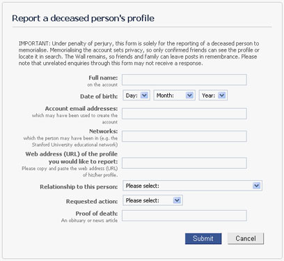 עמוד בקשת הנצחת הפרופיל בפייסבוק. אלו כל הפרטים שדרושים על מנת להפוך פרופיל למונצח.