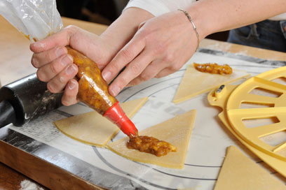 - בעזרת כפית או מזלף מניחים מעט מלית לאורך הצד הרחב של המשולש.