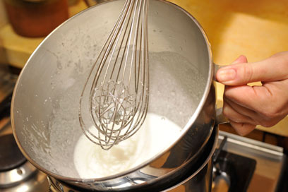 - שופכים את הסוכר והחלבון לקערת מיקסר. מניחים מעל בן-מארי וטורפים עם מטרפה עד להמסת הסוכר.