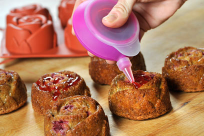 בעזרת מיכל ההזלפה הכדורי וחמשת הצנתרים ניתן להזליף, מילוי וקישוט עוגות ועוגיות. 87 שקלים, טי אנד פי גיל.