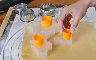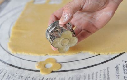 - מרדדים את הבצק לעובי 2-3 מ"מ על משטח מקומח וקורצים את העוגיות.