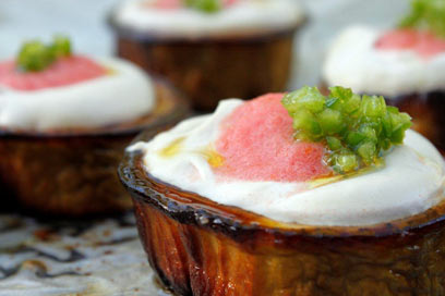 - מניחים לפרוסות החציל להתקרר מעט ומסדרים אותן על צלחת הגשה.