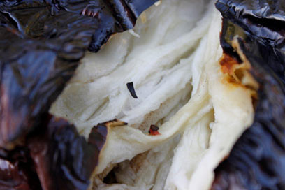 - מקלפים את הקליפה השרופה של החצילים. מעבירים את בשרם לקרש חיתוך וקוצצים אותם בעזרת סכין, עד שנוצר מרקם כמעט מחיתי.