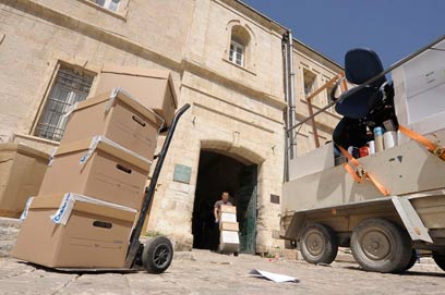 מקפלים את המשרדים בחצר סרגיי: ישראל תעביר מחר (יום ג') את החזקה על החצר ההיסטורית בירושלים לידי ממשלת רוסיה. בינתיים היום, לאחר שנים ארוכות של עבודה באתר, הגיעו עובדי משרד החקלאות והחברה להגנת הטבע להיפרד ולאסוף את חפציהם האישיים ולא האמינו למראה עשרות הסבלים שהוזמנו בבהילות מעמיסים על גבי המשאיות את תכולת המשרדים.