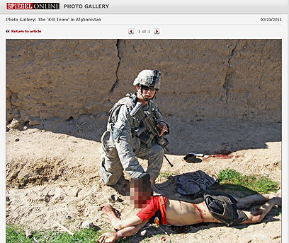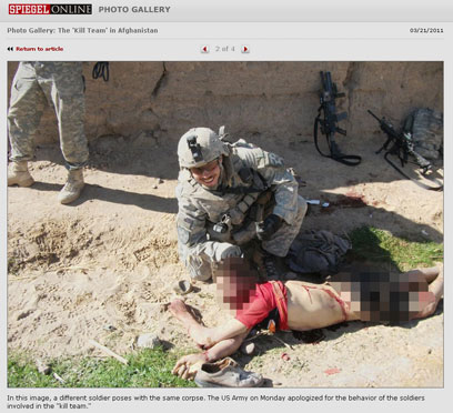 העיתון הגרמני "דר שפיגל" פרסם אתמול (יום א') תמונות קשות המראות שני חיילים אמריקנים מצטלמים מתעללים בגופה של אזרח אפגני, ג'ול מודין, שהואשם ברצח. בצבא ארצות הברית מיהרו להתנצל ופרסמו הודעת גינוי.