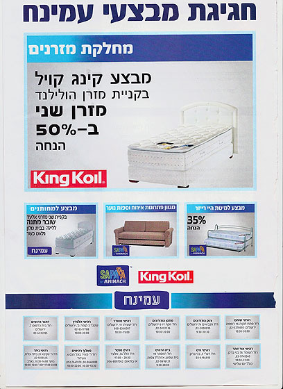 תחת הכותרת "חגיגת מבצעי עמינח" פורסמו במודעה מספר מיטות שונות, אולם אפילו לא אחת מהן זוגית. זאת, למרות העובדה שחרדים רבים כן רוכשים מיטות זוגיות הניתנות להפרדה בלילות, בהן על פי ההלכה היהודית יש להפריד אותן.