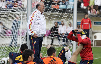 ויסנטה דל בוסקה ושחקניו בספרד. "בליטא יש יותר בוץ מדשא" (AFP)