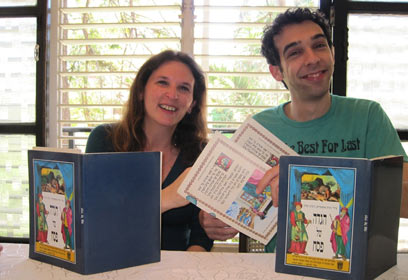 שיחזור של אחותי כלנית ואני עושים "החלפות" בדפי הגדת פסח המיתולוגית שלנו.