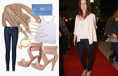 קרדיגן: סאקס, 318 שקל; גופיית בייסיק: קסטרו, 129 שקל; ג'ינס סקיני כהה: גאפ, 350 שקל; סנדלי עקב: מקס מורטי, 799 שקל; שרשרת: שלומית אופיר, 143 שקל; קלאץ': קרן וולף, 980 שקל