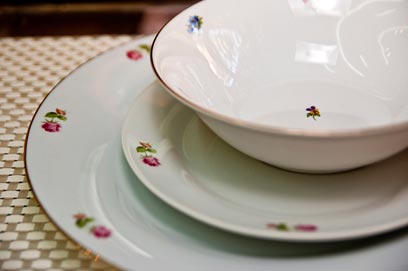 זילברשטיין מייבא את הפריטים בעצמו מצ'כיה וגרמניה, וההיצע מתחלף לעיתים קרובות. בתפריט: סטים שלמים ופריטים יחידים של וודג'ווד הבריטית ורוזנטל, קערות פירות עם עיטורי פירות, וכן שלל כוסות קריסטל וקערות עם עיטורי פרחים.