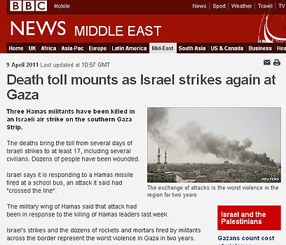 "מניין ההרוגים עולה בעת שישראל תוקפת שוב בעזה", בישרה הכותרת באתר BBC, שפעמים רבות נטען נגדו כי היא מסקר בצורה מגמתית אירועים שנוגעים לסכסוך הישראלי-פלסטיני. בדיווח נכתב כי "מספר ההרוגים בימים האחרונים בתקיפות הישראליות ל-17 לפחות, בהם כמה אזרחים", ירי עשרות הרקטות, בהן כמה למרכזי ערים, הוזכר וכך גם הצלחתה של מערכת "כיפת ברזל".