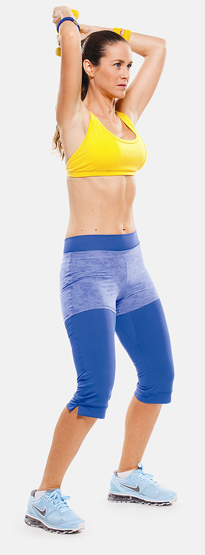 1. עמדי בפישוק נוח ואחזי במשקולת בשתי הידיים מעל הראש, המרפקים כפופים, הבטן אסופה, הישבן מכווץ.