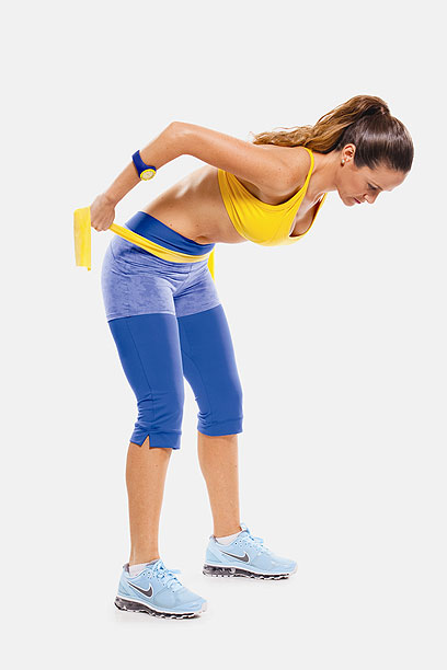 1. עמדי בפישוק ברוחב האגן, הברכיים כפופות, הגב כפוף קדימה, והראש משוחרר כלפי הרצפה. אחזי בשני קצות הגומייה והניחי אותה על הבטן, המרפקים לכיוון התקרה.